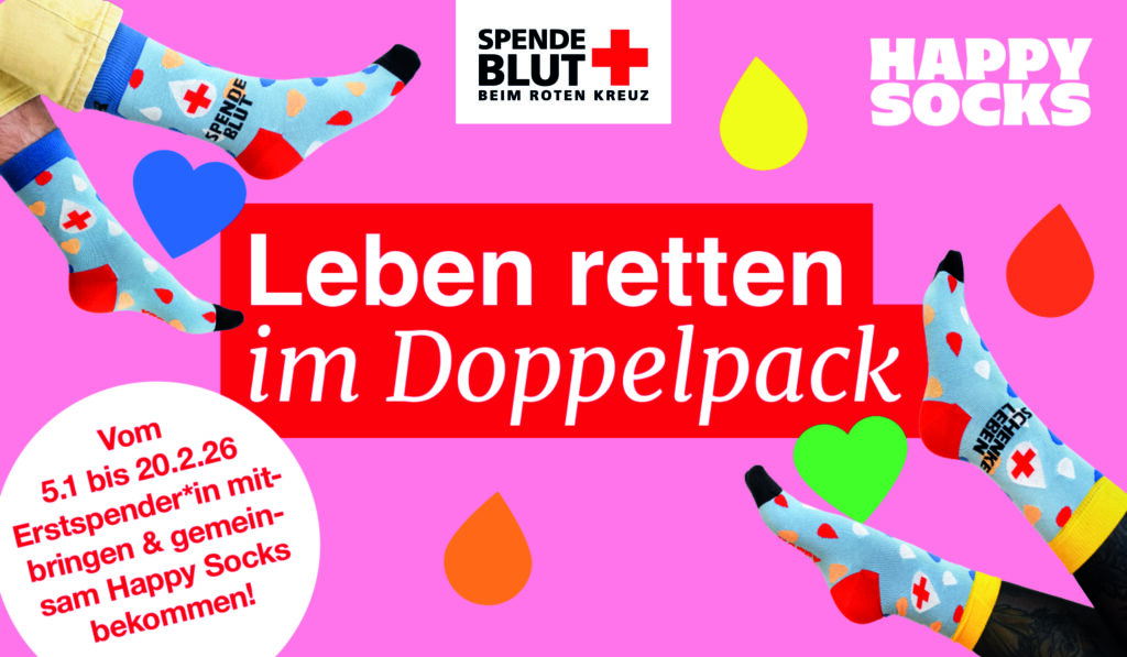 LEBEN RETTEN IM DOPPELPACK: Im Aktionszeitraum vom 05.01. bis 20.02.2026 erhalten alle Spendenden, die gemeinsam mit einer / einem neuen Erstspender*in Blut spenden, oder beide gemeinsam zum ersten Mal Blut spenden, exklusive Happy Socks.